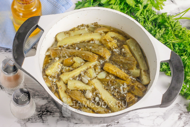 Выложите всё содержимое миски в казан или кастрюлю с антипригарным дном. Поместите емкость на плиту и потушите все на умеренном нагреве примерно 30 минут. Нарезка огурцов должна сменить свой цвет и провариться в маринаде. Не забывайте перемешивать.