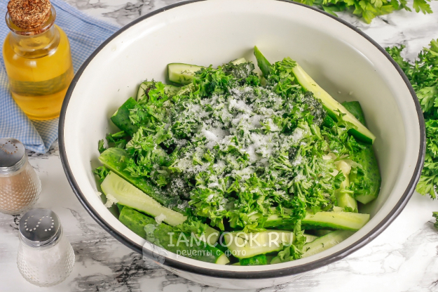 Мелко нарежьте укроп и петрушку, добавьте в емкость. Всыпьте соль и молотый черный перец.