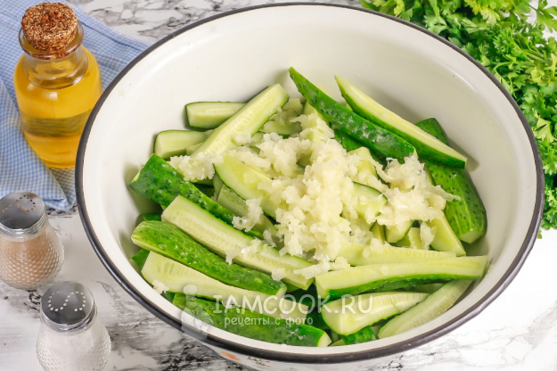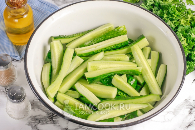 Выберите овощи средней длины, почти такие же по длине, как дамские пальчики. Промойте огурцы в воде, смойте пыль и грязь. Срежьте хвостики и очистите чесночные зубчики. Промойте зубчики вместе с зеленью. Нарежьте огурцы четвертинками и выложите в глубокую миску или салатник.