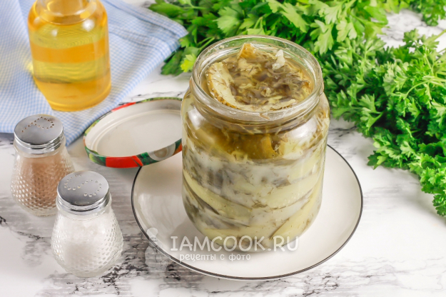 Ошпарьте банки и крышки кипятком, выложите в них горячий салат до верха вместе с маринадом.