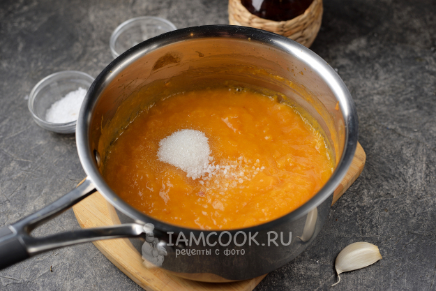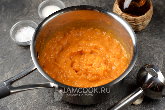 Пробейте абрикосовую мякоть погружным блендером до состояния пюре.