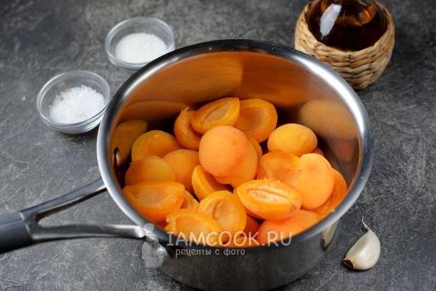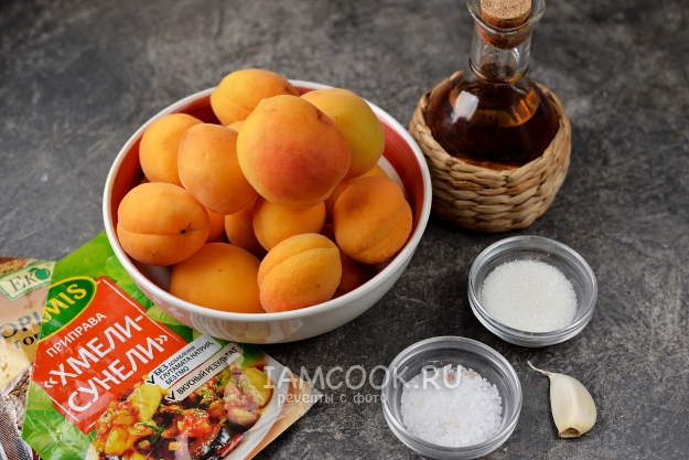 Соберите ингредиенты для приготовления ткемали из абрикосов на зиму. Абрикосы помойте и обсушите.