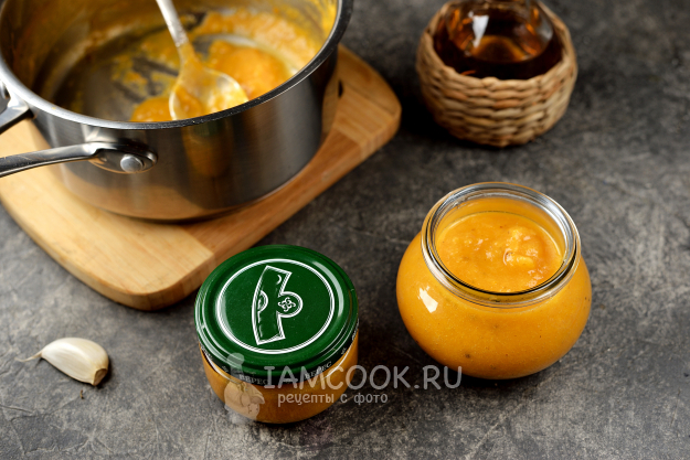 Разлейте соус по небольшим порционным стерильным баночкам, закрутите крышками, переверните вверх дном, укутайте в теплые одеяла до полного остывания.