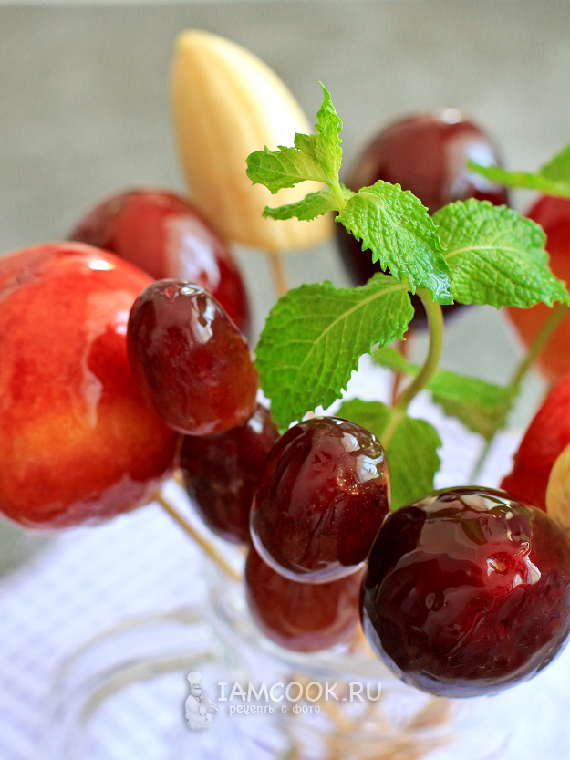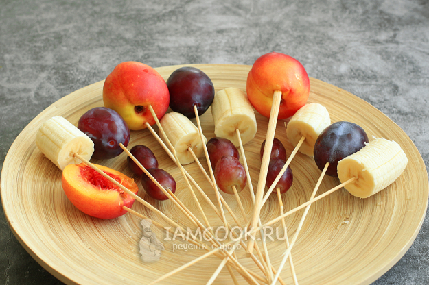 Тонкие и длинные шпажки подходят для винограда и ягод, более плотные - для слив и банана. Еще более толстые - для мелких яблок и нектаринов. Также вы должны ощущать, что при нанизывании фруктов шпажка сидит плотно и не скользит, иначе в самый ответственный момент фрукты или ягоды соскользнут с нее в сироп.