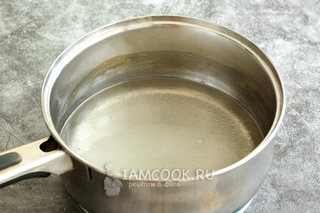 Одновременно подготовьте стакан с ледяной водой для проверки карамели на готовность. И еще одну емкость с ледяной водой для "купания" фруктов в ней.
