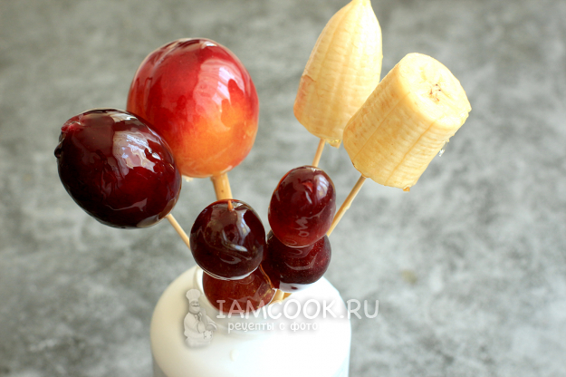 Нанизайте фрукты на шпажки. Мне пришлось на ходу менять тонкие шпажки на более плотные и короткие, так как после карамели фрукты становились гораздо тяжелее и пытались слететь с "насеста".