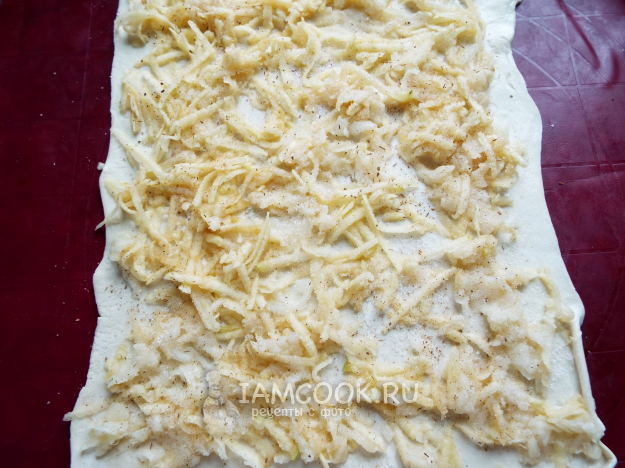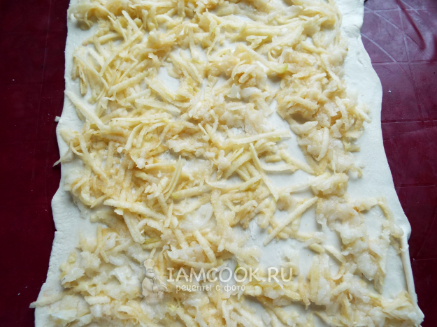 Тесто раскатать в тонкий пласт. Разложить натёртые фрукты.