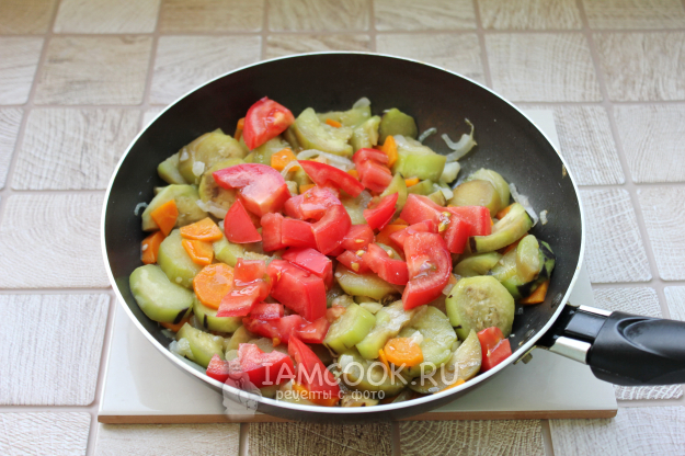 Тушите баклажаны с луком и овощами 5-6 минут, перемешивая. После добавьте нарезанные помидоры и перемешайте.