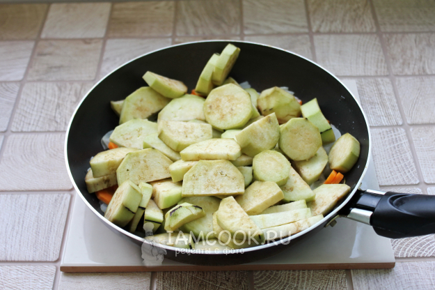 Баклажаны помойте, очистите и нарежьте не очень мелко. Добавьте к моркови и луку.