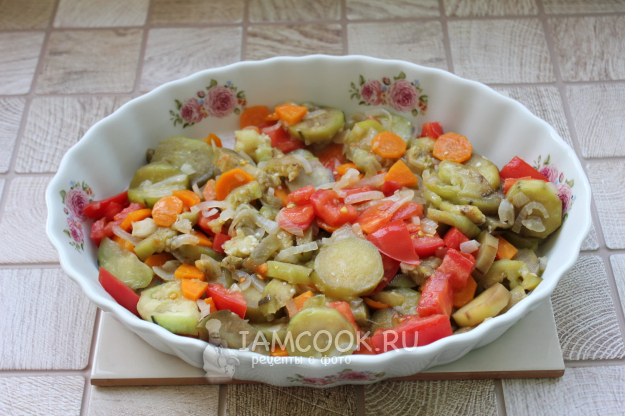 Тушеные овощи переложите в жаростойкую форму для запекания.