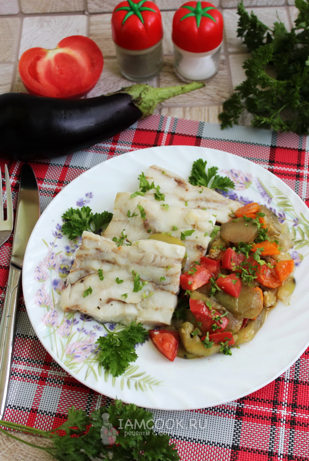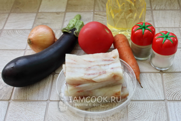 Возьмите все ингредиенты для приготовления минтая с баклажанами и помидорами в духовке.