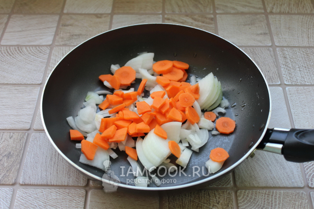 Морковь и репчатый лук очистите, помойте и нарежьте произвольно. Выложите в сковороду с подсолнечным маслом. Тушите на среднем огне, периодически перемешивая, 5-7 минут.