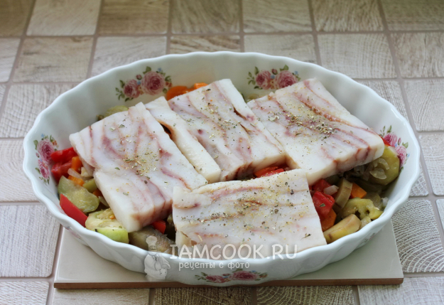 Филе минтая разморозьте, помойте и разложите на овощах. Посолите и поперчите по вкусу. Соль и перец можно заменить приправой для рыбы, где есть эти компоненты.