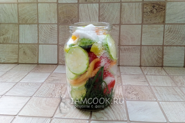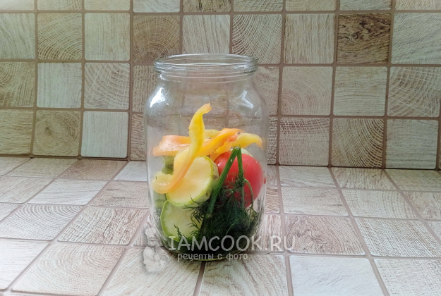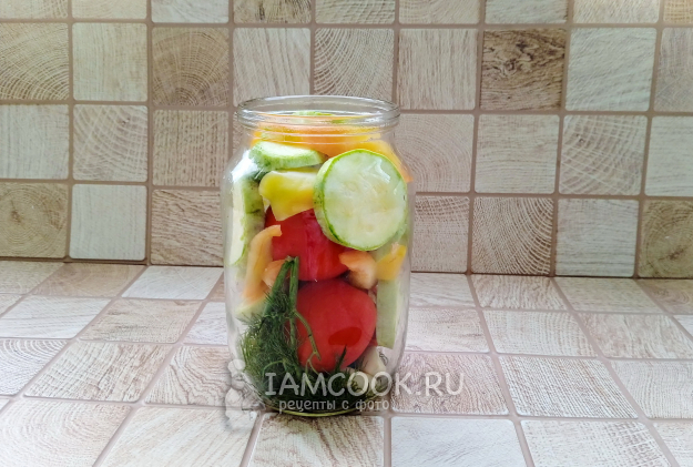 Таким образом чередуя кабачок, помидор и перец, заполните банку до верха.