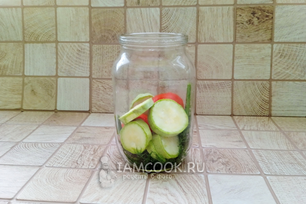 Кабачок помойте. Молоденький можно не чистить. Нарежьте кружками и выложите в банку несколько штук.