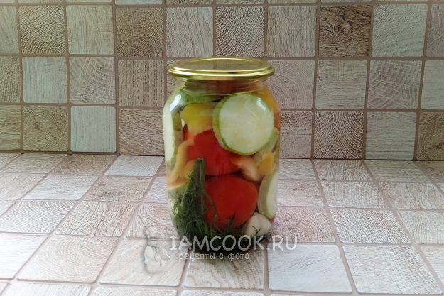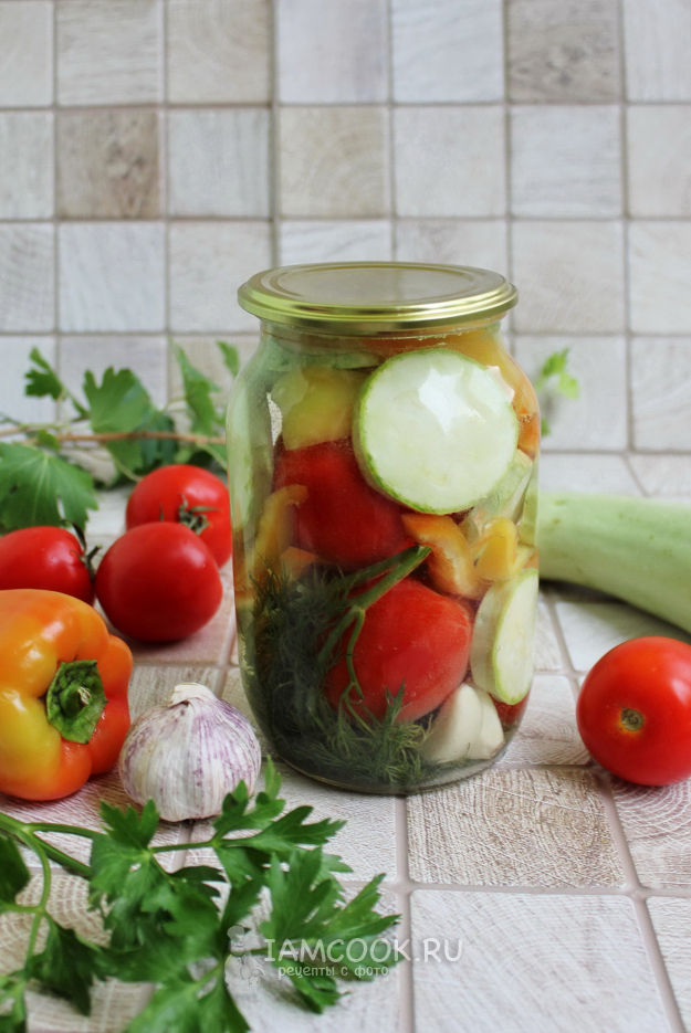 Маринованные кабачки с помидорами и перцем на зиму готовы. Храните в домашней кладовке без отопления, подвале, погребе.