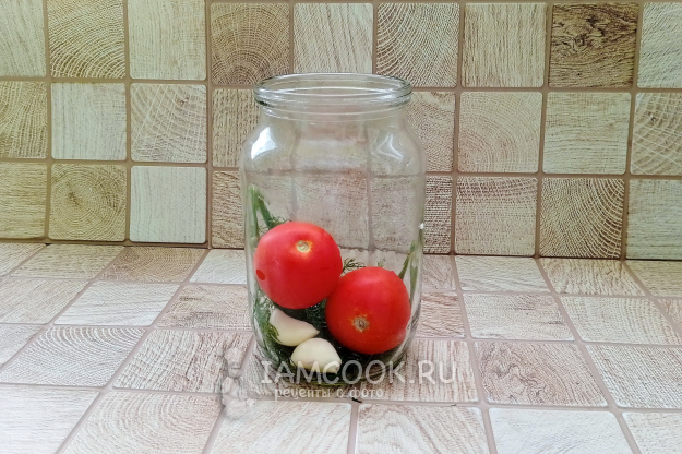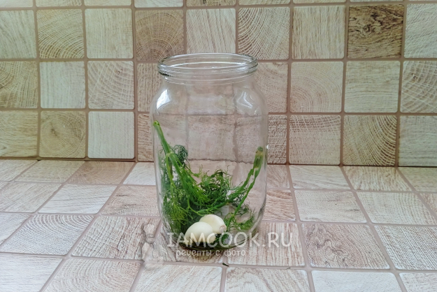 В стерилизованную банку выложите промытый укроп и несколько очищенных зубчиков чеснока.