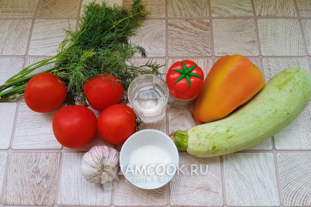 Продукты для заготовки маринованных кабачков, с помидорами и перцем на зиму подготовьте по списку ингредиентов.