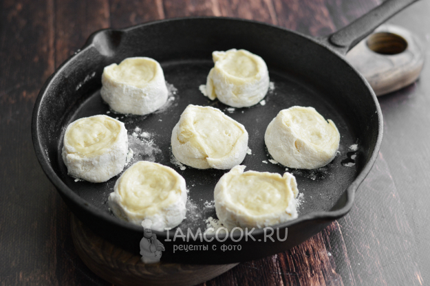 Донышко опёкиша обмакните в муку. Выложите на противень или сковороду. Время расстойки небольшое - минут 10-15.