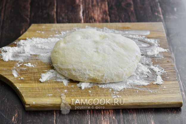 Поверхность подпылите обильно мукой, выложите на поверхность тесто. Сильно его не мните, чтобы не выпустить пузырьки.