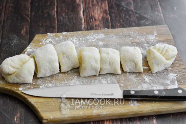 Скатайте тесто в произвольный толстый жгут, хорошо обваляйте в муке и нарежьте на куски. Размер и форма - на свой вкус. Прямо, наискосок - как хотите.