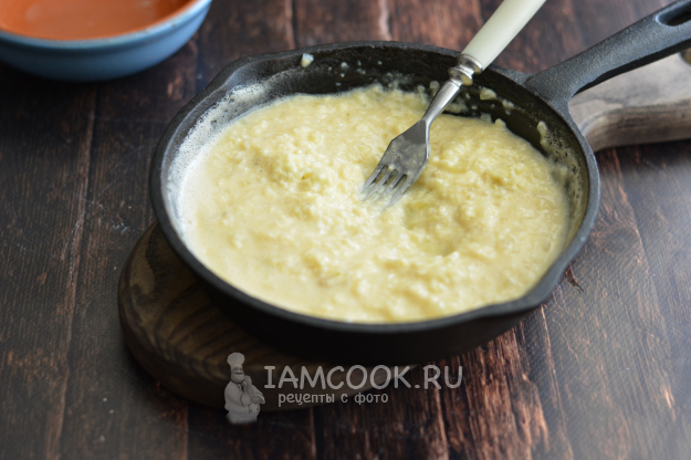 В сковороду с луком влейте яйца и начните мешать очень интенсивно. Огонь поддерживайте средний. Яйца должны начать густеть, превращаясь в соус, но сильно не зажаривайте, чтобы яйца не сварились в омлет. Делается это всё очень быстро - не более двух минут.