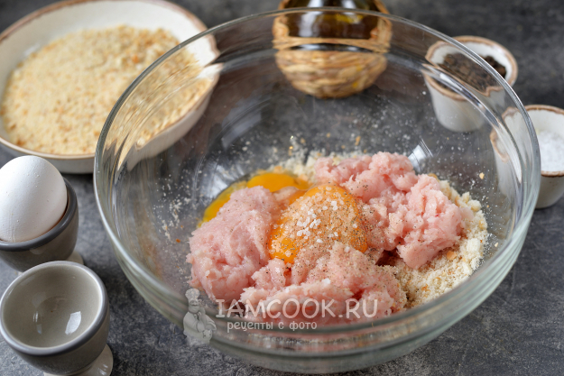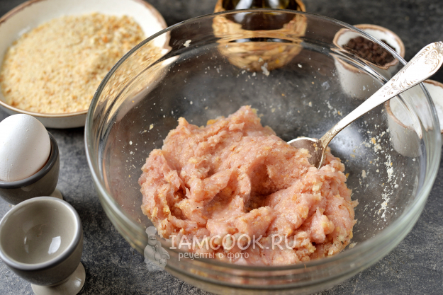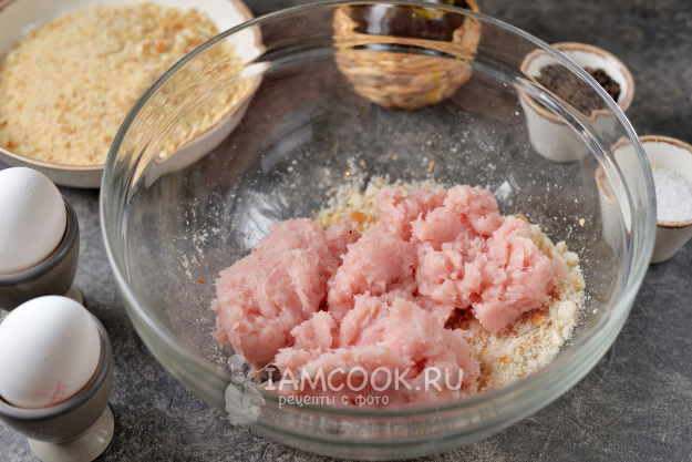 В глубокую миску пересыпьте хлебную крошку, добавьте куриный фарш.