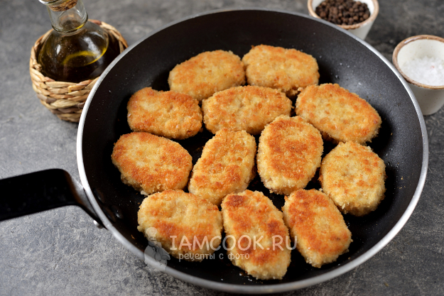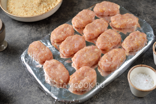 Разделочную доску выстелите фольгой, мокрыми руками сформируйте небольшие заготовки в виде классических наггетсов, выложите их на фольгу, отправьте в морозилку минут на 15-20.