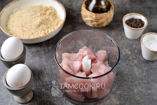 Следом нарежьте куриное филе, пробейте его блендером в однородный фарш.