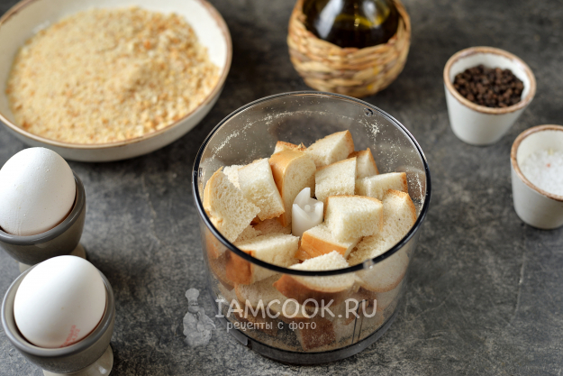 Батон нарежьте кубиками, сложите в блендер, смелите в крошку.