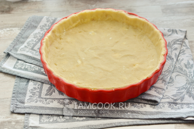 Достаньте тесто из холодильника, раскатайте его в пласт и распределите по форме. Края срежьте аккуратно.