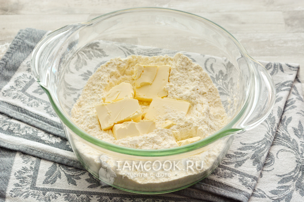 В миску просейте муку, смешайте её с разрыхлителем, добавьте нарезанное кусочками масло. Если масло твердое, то его можно натереть на тёрке для удобства. После чего руками разотрите масло с мукой в крошку.