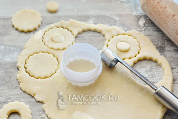 Теперь необязательный пункт. У меня осталось немного теста. Я раскатала его и вырезала формочкой для печенья и выемкой для яблок колечки.