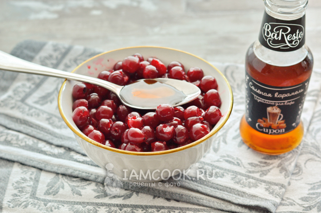 Добавьте к вишне сироп, перемешайте и дайте постоять 10 минут.
