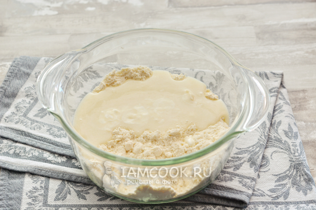 Для заливки смешайте яйца, сахар, сметану и крахмал.