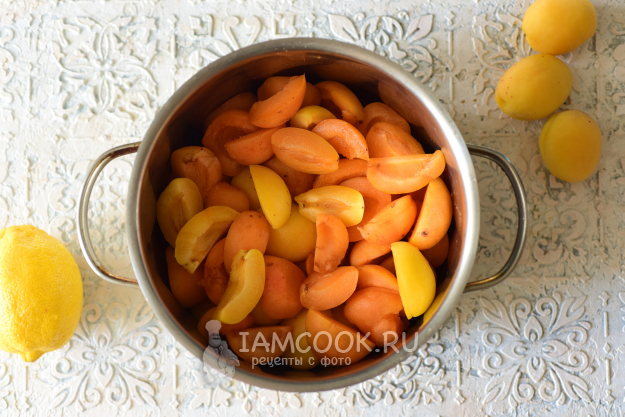 У абрикосов извлечем косточки и нарежем плоды на четвертинки, выложим в кастрюлю.