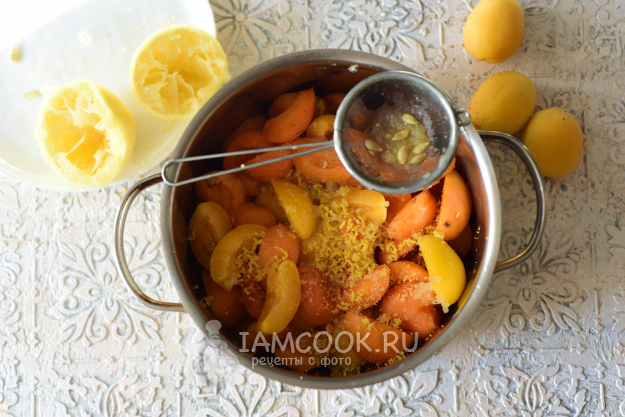 Натрем цедру лимона на мелкой терке и выложим к абрикосам. Затем лимон разрежем на 2 части и прямо в кастрюлю, через ситечко (фильтруем косточки) выдавим лимонный сок.