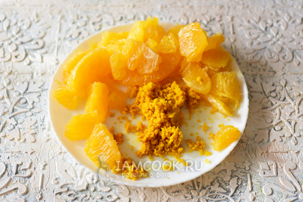 Цедру с двух апельсинов натрем на мелкой терке. Мякоть апельсина освободим по возможности от всех белых пленочек-перегородок.