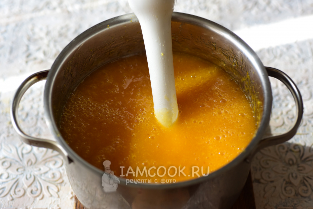 С момента закипания проварим 15 минут, после чего аккуратно перебьем абрикосовую массу погружным блендером до получения однородной смеси.