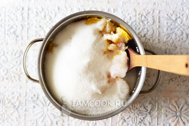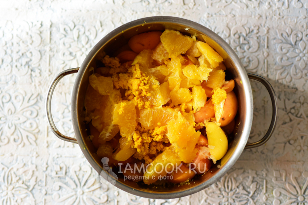 Цедру и мякоть апельсина выложим в кастрюлю к абрикосам.