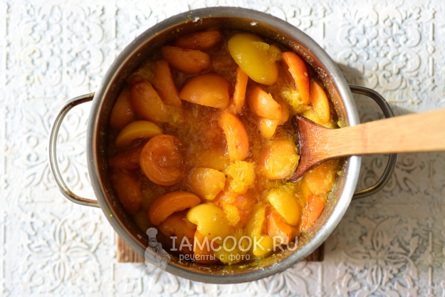 Будем варить джем из абрикосов еще 15 минут, помешивая ложкой, на том же уровне огня.