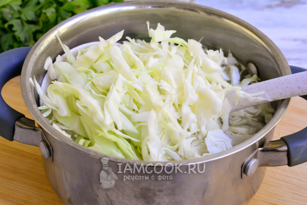 Когда картофель будет готовым и мягким, добавьте в кастрюлю нашинкованную капусту. Варите капусту 5-7 минут.