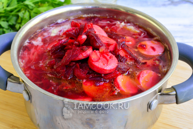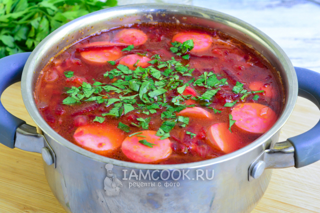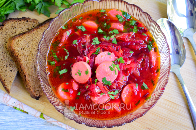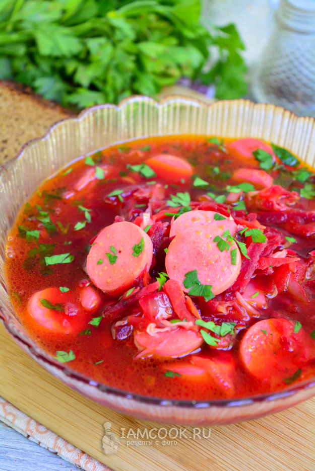 В горячем виде подавайте борщ с сосисками к столу. Получилось быстро, просто и очень вкусно.