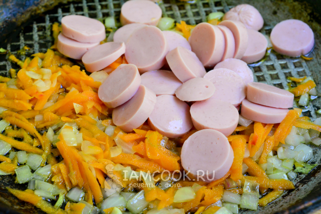 Разогрейте масло на сковороде, всыпьте лук с морковкой, пассеруйте овощи 3-4 минуты, добавьте нарезанные колечками сосиски и обжаривайте все вместе еще пару минут на небольшом огне.