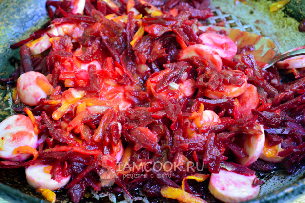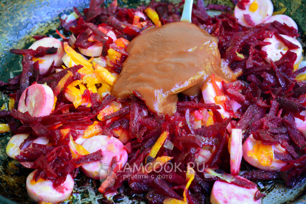 Затем добавьте в сковороду натертую свеклу, пассеруйте ее с овощами 2-3 минуты, затем заправьте овощную смесь томатной пастой.