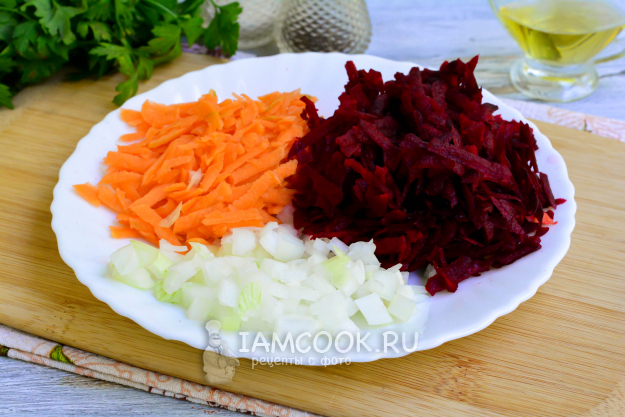 Пока варится картофель, приготовьте овощную зажарку. Почистите лук, морковь и свеклу. Морковь и свеклу натрите на терке, а лук накрошите небольшими кубиками.