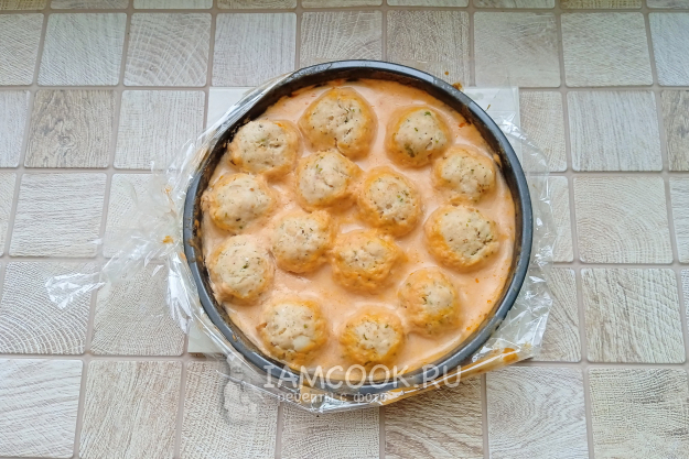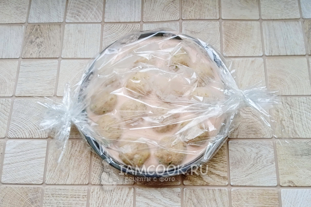 Форму с тефтелями поместите в рукав для запекания, закрепляя концы.