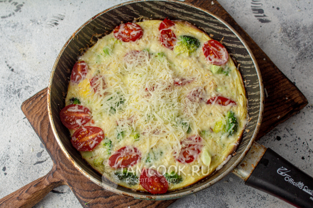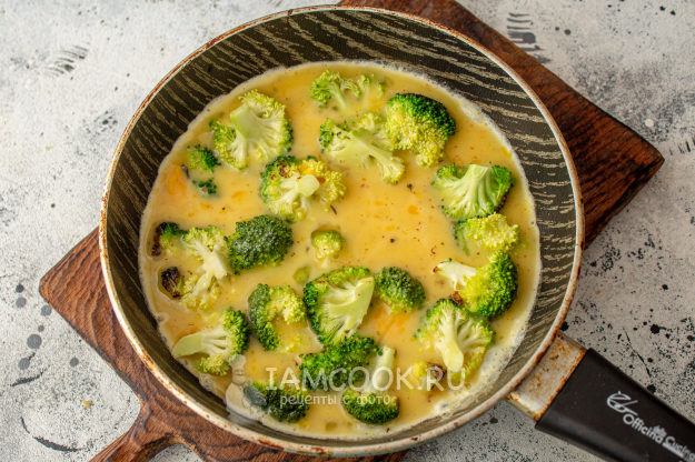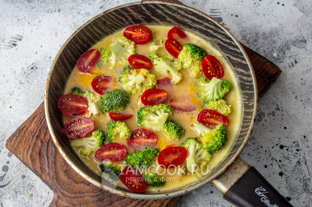 Ингредиенты для приготовления омлета с брокколи и помидорами на сковороде - перед вами.