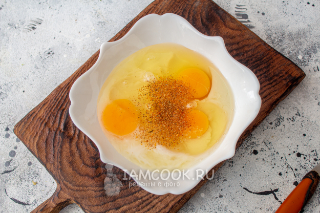 Соедините в подходящей посуде яйца, молоко, соль и черный молотый перец. Перемешайте их вилкой или венчиком.