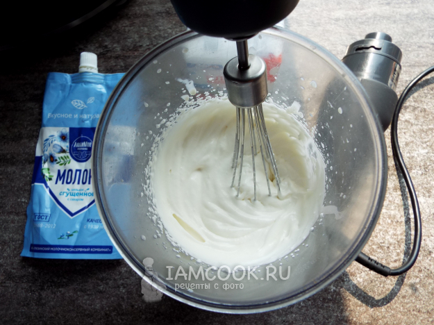 Холодные сливки и сгущенку взбить в крепкие пики.